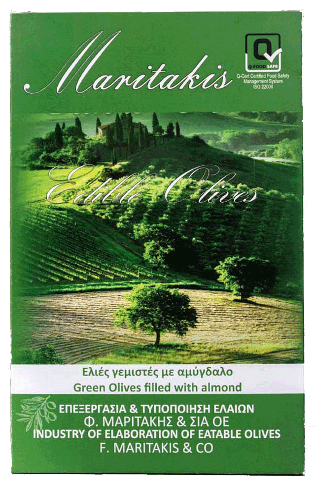 grflagΣυστατικά: Ελιές, άλμη, ηλιέλαιο, αλάτι, σόδα, ρυθμιστής οξύτητας: γαλακτικό οξύ, συντηρητικό: σορβικό οξύ, μέσο οξίνισης: κιτρικό οξύ, αντιοξειδωτικό: ασκορβικό οξύ.