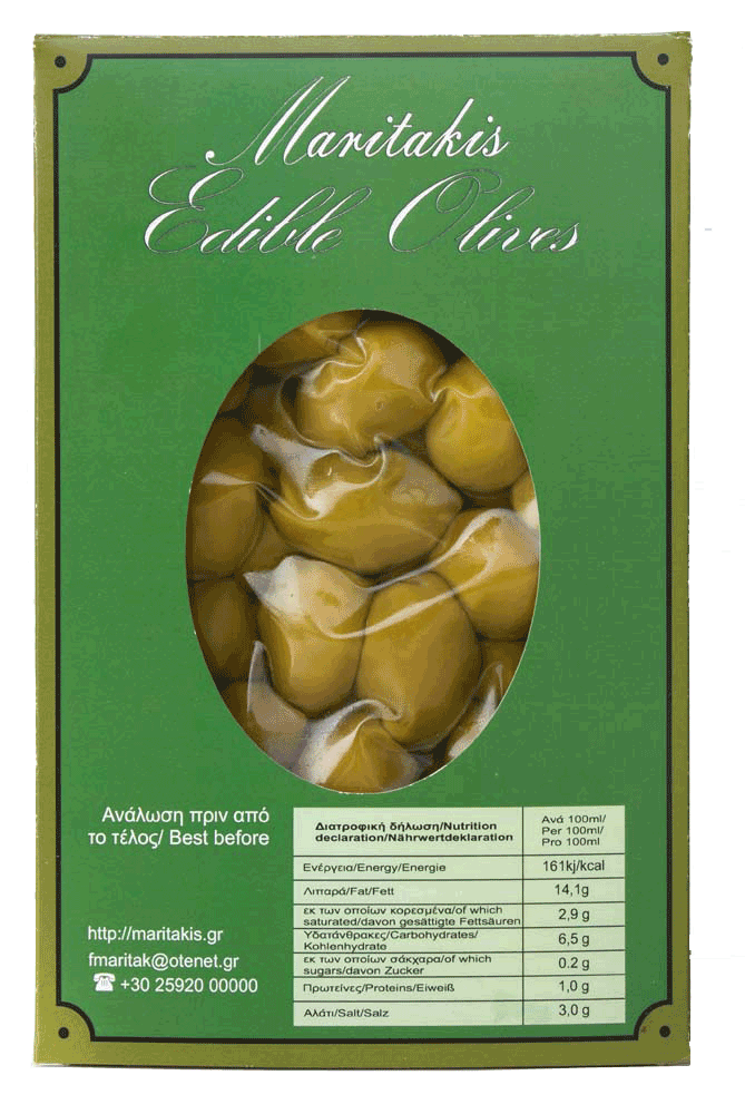 grflagΣυστατικά: Ελιές, άλμη, ηλιέλαιο, αλάτι, σόδα, ρυθμιστής οξύτητας: γαλακτικό οξύ, συντηρητικό: σορβικό οξύ, μέσο οξίνισης: κιτρικό οξύ, αντιοξειδωτικό: ασκορβικό οξύ.