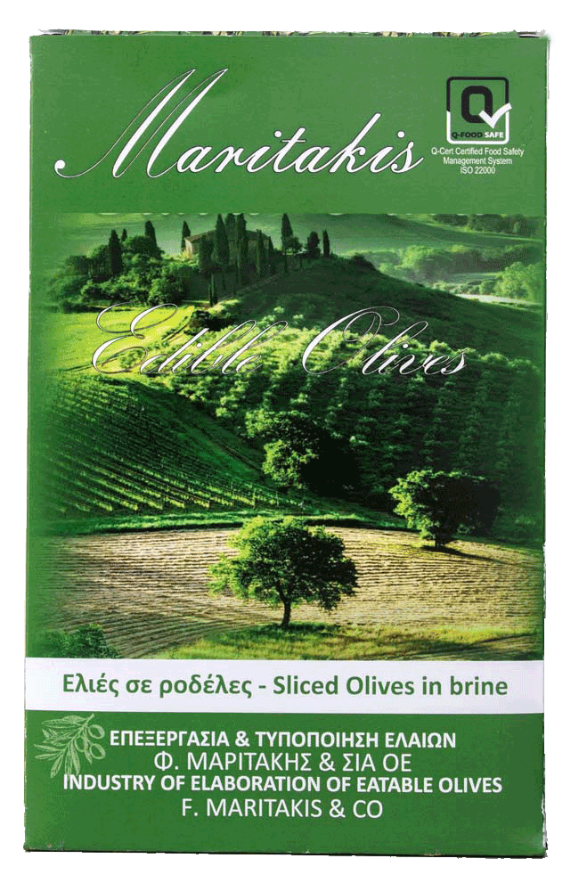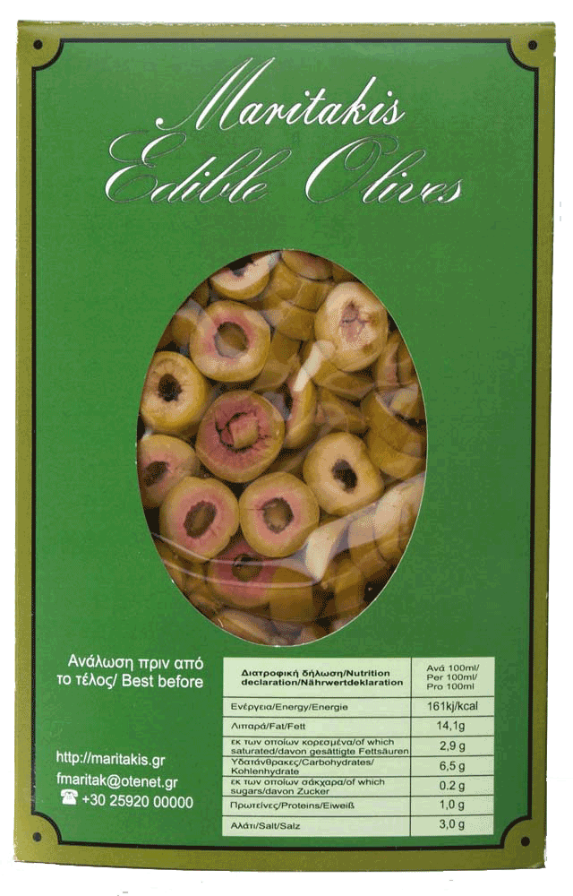 Συστατικά: Ελιές, άλμη, ηλιέλαιο, αλάτι, σόδα, ρυθμιστής οξύτητας: γαλακτικό οξύ, συντηρητικό: σορβικό οξύ, μέσο οξίνισης: κιτρικό οξύ, αντιοξειδωτικό: ασκορβικό οξύ.